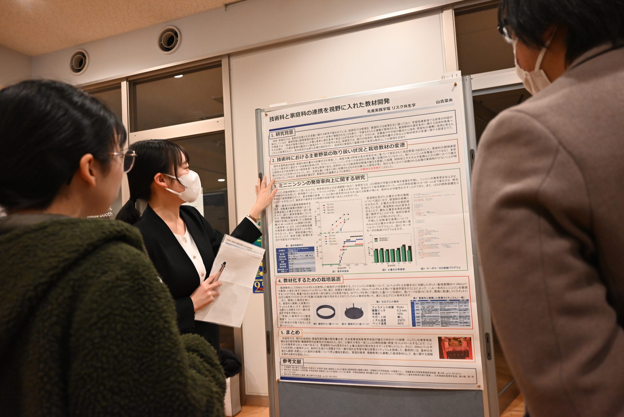 2月13日12:00より、中央図書館情報ラウンジにて2024年度の先進実践学環修士論文発表会が行われました。33名の学生が2グループに分かれてポスター発表を行い、発表者以外の参加者も教員・学生など計140名にのぼりました。多様な分野が含まれるのが先進実践学環の研究内容の特徴ですが、ワークショップI・IIで専門性の異なる相手に対する説明や議論の経験を重ね、修士論文を提出した学生の皆さんが、わかりやすく堂々と研究発表をしている姿が印象的でした。ポスターの前では活発な質疑や議論が行われ、学環生の知的好奇心と学修意欲が大いに発揮される機会となりました。
