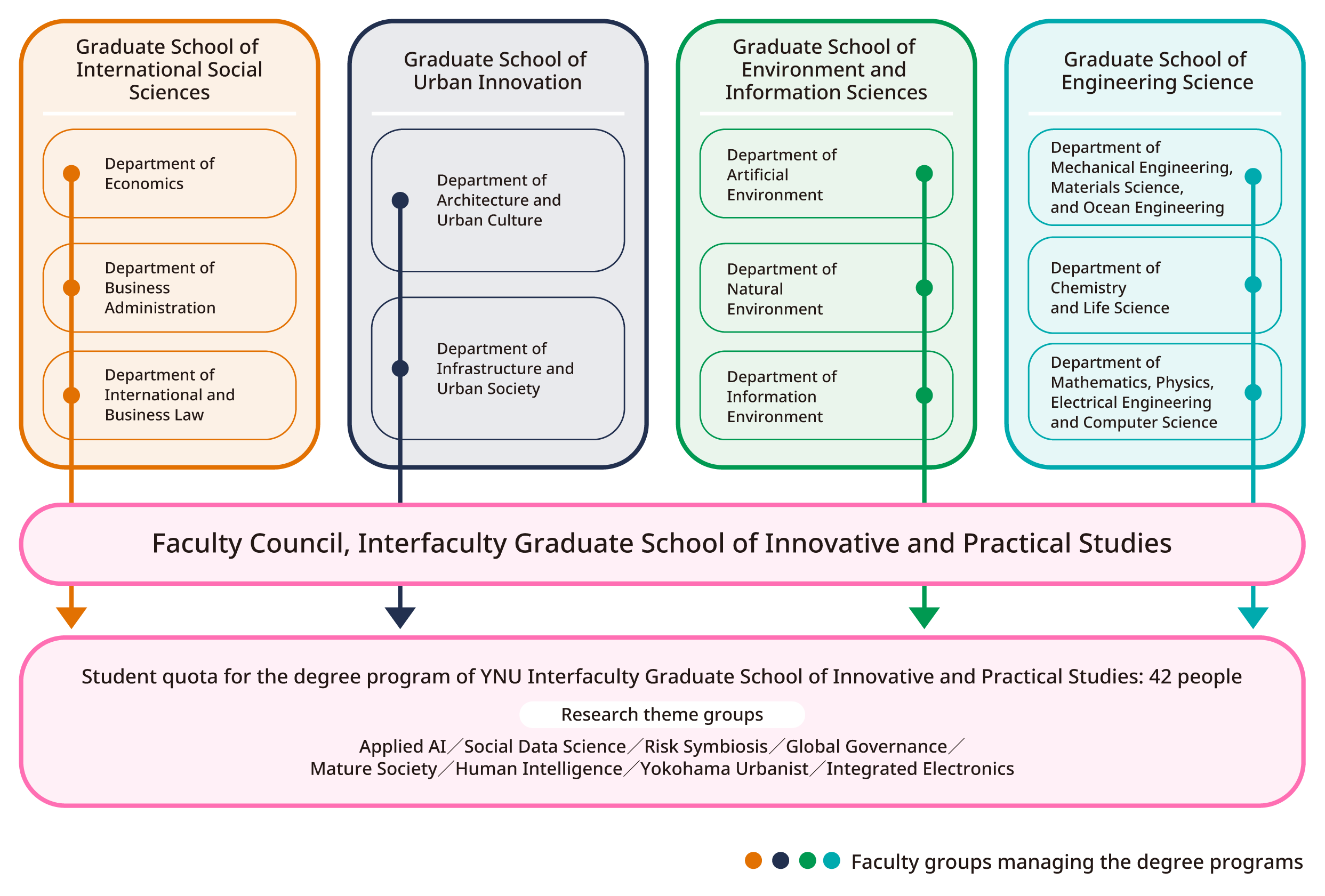 The Interfaculty Graduate School of Innovative and Practical Studies was launched in 2021 as a unique graduate school that combines the university’s diverse academic fields and provides education that integrates humanities and sciences across disciplines, and in 2023 our first students successfully completed their studies and left for the world. The Interfaculty Graduate School of Innovative and Practical Studies is a collaboration of four graduate schools of Yokohama National University (the Graduate School of International Social Sciences, Graduate School of Urban Innovation, Graduate School of Environment and Information Sciences, and Graduate School of Engineering Science), with approximately 180 faculty members offering more than 500 courses in a variety of fields. We believe that by studying here, students will be able to explore the “forest of knowledge” that spans the various graduate schools within the university, freely absorb knowledge that is useful for their own research, and take on the challenge of integrating it to produce novel results. We hope to see more and more innovative and practical research results that will solve the problems of human society in the near future by practicing the integration of knowledge from different fields.